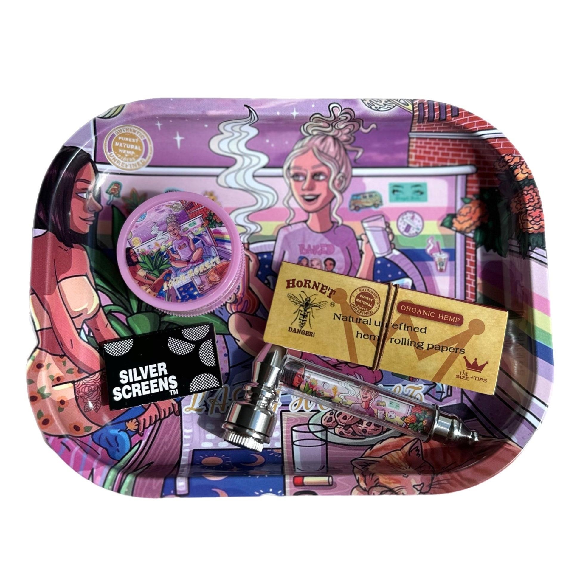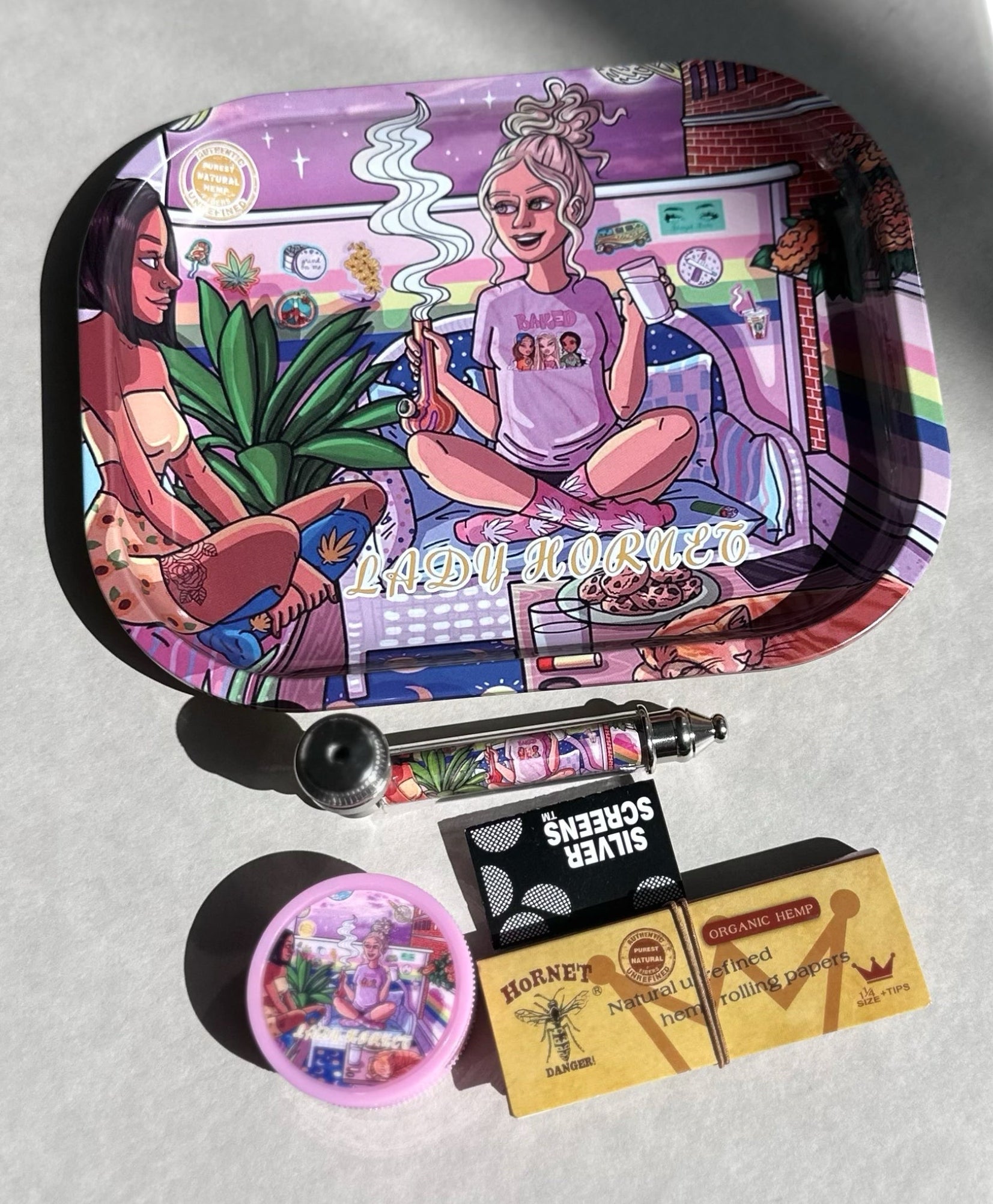 Lady Hornet Rolling Tray Set – Complete Smoking Kit w/ Grinder, Papers, Screens & One Hitter.